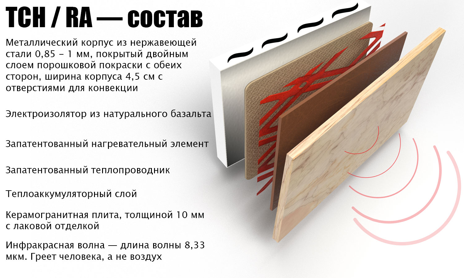 - Длинная инфракрасная волна просачивается сквозь керамогрантиную плиту, прогревая равномерно площадь. Обогревает человека и предметы;